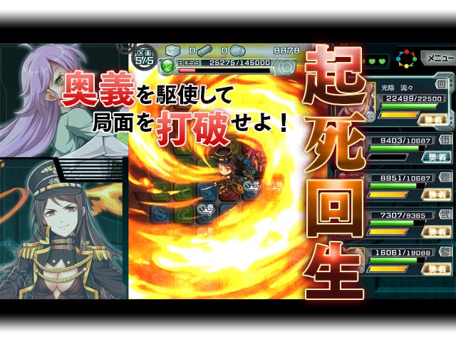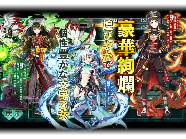 簡単操作でド迫力なバトルが楽しめるパズルRPGに加え、四字熟語を冠する個性豊かな文字乙女と共に憎き帝国を打ち滅ぼそう!